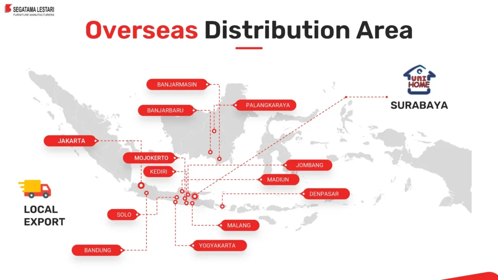 With strong distribution channels across the archipelago, we deliver furniture to residential, commercial, and hospitality clients in key Indonesian cities.